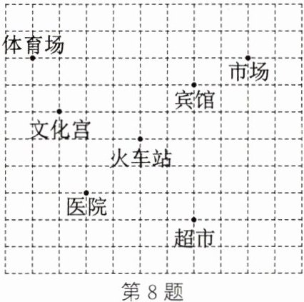8. 如图,这是某市部分简图,请以火车站为坐标原点建立平面直角坐标系,并分别写出超市、体育场和医院的坐标.