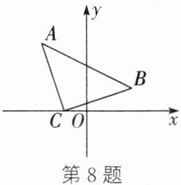 8. 如图,小敏将等腰直角三角尺$ABC$放置于平面直角坐标系中,直角顶点$C$与$x$轴上表示$-1$的点重合,点$B$的坐标为$(2,1)$,则点$A$关于$y$轴的对称点$A'$的坐标为(