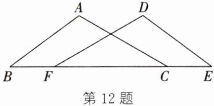 12. (2024·泉山期中)如图,点$B$,$F$,$C$,$E$在同一条直线上,$\triangle ABC\cong\triangle DEF$,$AB = 6$,$BC = 11$,$BF = 3$,$\angle ACB = 30^{\circ}$. 求$\angle DFE$的度数及$DE$,$CE$的长.