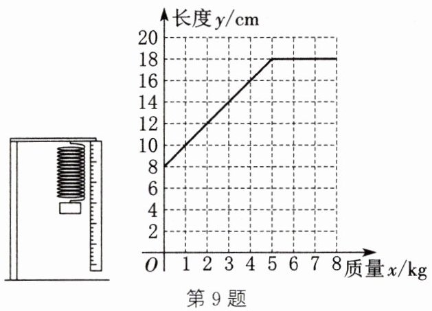 9. 在一次实验中,小明把一根弹簧的上端固定,在其下端悬挂物体,测得弹簧的长度ycm随所挂物体的质量xkg变化关系的图象如图所示: