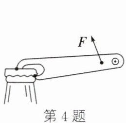 4. 如图所示,用开启啤酒瓶盖的工具开启瓶盖。请在图中标出支点 $ O $ 的位置,画出力 $ F $ 的力臂。