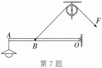 7. 某剧组为拍摄节目需要,设计了如图所示的拉力装置来改变照明灯的高度,轻质杠杆 $ ABO $ 可绕 $ O $ 点转动,请在图中画出杠杆所受拉力的力臂 $ l_{1} $ 和杠杆所受阻力 $ F_{2} $ 的示意图。