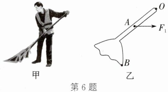 6. (2024·广东三模)如图甲所示为工人师傅用笤帚扫地的情景。把左手握处视作支点,右手作用在笤帚上 $ A $ 点的动力为 $ F_{1} $。请在图乙中画出作用在 $ B $ 点的阻力 $ F_{2} $ 的示意图及动力臂 $ l_{1} $。