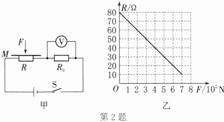 2. (2023·河南)某物理实践小组设计了一种工程上的压力测量装置,其原理如图甲所示,电路中电源电压恒为6V,定值电阻R₀的阻值为20Ω,电压表的量程为0~3V,轻质绝缘的压力检测板M与力敏电阻R相连,R的阻值与压力F的关系如图乙所示。闭合开关S后,试问: