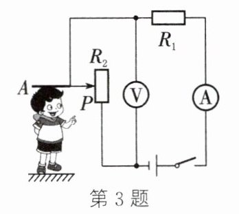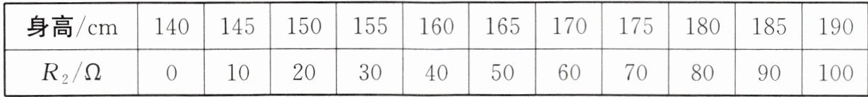 3. (跨学科实践·日常生活)如图所示为课外活动时同学们设计的电子身高测量仪的电路简图,绝缘板A与滑动变阻器R₂的滑片P固定在一起,且同步上下移动。已知电源电压恒为20V,定值电阻R₁=30Ω,滑动变阻器的规格为"100Ω 1A",电压表的量程为0~15V,电流表的量程为0~3A。如表为R₂接入电路的阻值与被测者身高的对应关系。