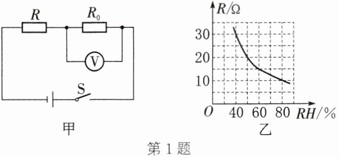 1. (2023·山西)小伟给学校劳动实践基地的蔬菜大棚设计了一个测量空气湿度的电路图,如图甲所示。电源电压恒为6V,定值电阻R₀的阻值为20Ω,湿敏电阻R的阻值随空气湿度RH的变化关系如图乙所示。下列分析正确的是 (