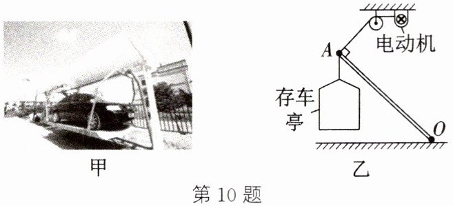 10. (2024·淄博沂源二模)如今大城市普遍存在着停车难的问题,图甲是集存车、绿化、景观、防盗、户外广告等多功能为一体的“路边空中绿化存车亭”。图乙为“路边空中绿化存车亭”的工作原理图。$O$为转动轴,存车亭固定在$A$端,电动机借助定滑轮用绳将杆拉起。如果不考虑杆的重力和机械各部分的摩擦力,小汽车从水平地面被提升到如图所示的位置,作用在$A$点的动力将(