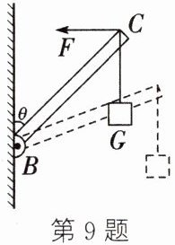 9. 如图所示,轻质细杆$BC$可绕竖直墙上的$B$点转动,末端$C$点挂一重物,重力为$200N$,拉力$F$始终沿水平方向,此时$\theta = 45^{\circ}$,则拉力$F=$