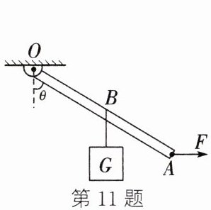 11. (易错题)如图所示,$OA$是轻质杠杆,杠杆中间悬挂一重物$G$,$A$端自始至终受到一个水平方向的拉力$F$的作用,在将杠杆慢慢绕逆时针方向转动的过程中,下列关于力$F$的说法正确的是(