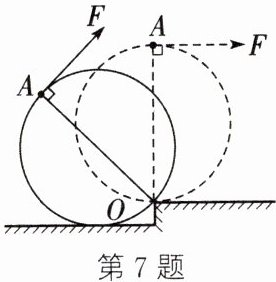 7. 如图所示,质地均匀的圆柱在拉力$F$的作用下由实线所示位置匀速转到虚线所示位置,整个过程中,拉力$F$始终作用于$A$点且与$OA$保持垂直($OA$为圆柱横截面的一条直径),圆柱在转动过程中不打滑。下列分析正确的是(