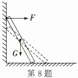 8. 一根粗细均匀的木棒斜靠在竖直墙壁上,墙壁光滑,地面粗糙,木棒受到的重力为$G$,墙壁对木棒的弹力为$F$,如图所示。现让木棒的倾斜程度变小一些至虚线所示位置,木棒仍能静止斜靠在墙上。与原来相比,$F$的变化情况为