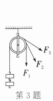 3. 如图所示,用一根绳子绕过定滑轮,一端拴在钩码上,手执另一端,分别用力$F_{1}$、$F_{2}$、$F_{3}$匀速拉起钩码。忽略绳子与滑轮的摩擦,下列说法中正确的是(