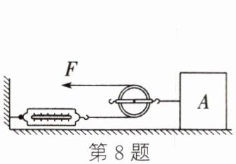 8. 如图所示,物体A在水平拉力F的作用下,以0.2m/s的速度在水平面上做匀速直线运动,此时弹簧测力计的示数为2N。若不计滑轮、弹簧测力计和绳的重力及滑轮与绳之间的摩擦,则下列说法中正确的是(