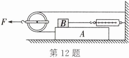 12. 小黄同学用水平力F拉动如图所示装置,使重为200N的物体A5s内在水平地面上匀速运动120cm,物体B重为100N(物体B与A始终接触),此过程中A受到地面的摩擦力为24N,弹簧测力计的示数为16N。若不计滑轮重、弹簧测力计重、绳重和绳与滑轮间摩擦,则滑轮移动的速度为