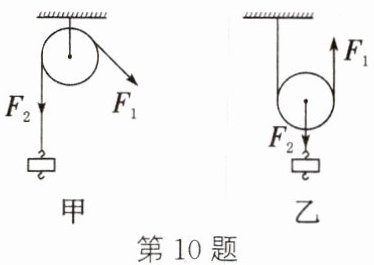 10. 如图所示,将滑轮抽象成杠杆,并标出支点O,画出动力$F_{1}$、阻力$F_{2}$的力臂$l_{1}$和$l_{2}$。