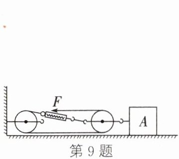 9. 如图所示,滑轮组不计滑轮、绳、弹簧测力计重及轮与轴间的摩擦,在用力拉动物体A向左匀速运动的过程中,若物体与地面间的摩擦力$ f = 18N $,绳端移动速度为0.6m/s,则(
