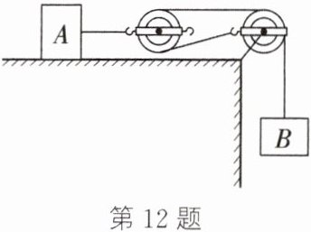 12.20 40 解析:如题图所示,左侧为动滑轮,右侧为定滑轮,绳子段数为2,B挂在绳子自由端,绳子自由端受到的拉力$F = G_{B} = 10N$,不计绳重、滑轮重及绳子与滑轮间的摩擦时,$F = \frac{1}{n}f$,则物体A受到桌面的摩擦力$f = nF = 2×10N = 20N$。物体A水平向左运动或水平向右运动时,由于压力不变,接触面粗糙程度不变,物体A受到的摩擦力不变,所以物体A 水平向左运动时,受到水平向右的摩擦力也是20N。物体A水平向左匀速直线运动时,水平方向上受到水平向左的拉力、水平向右的拉力20N(滑轮组对物体A施加的)、水平向右的摩擦力20N;水平向左的拉力和水平向右的拉力、水平向右的摩擦力是平衡力,三力平衡,则水平向左的拉力$F_{左} = F_{右} + f = 20N + 20N = 40N$。