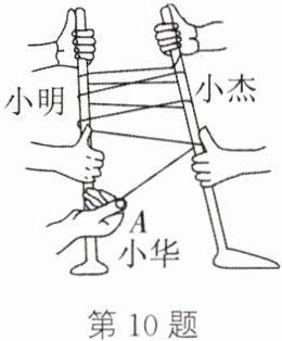 10. 如图所示,小明和小杰握住两根较光滑的木棍,小华将绳子的一端系在其中一根木棍上,然后依次将绳子绕过两根木棍,小明和小杰相距一定的距离握紧木棍站稳后,小华在图中A处拉绳子的另一端,用很小的力便能拉动他们,两根木棍和绳子组成的机械相当于