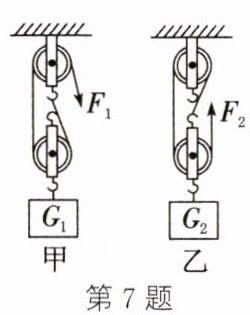 7. (2023·邳州段考)如图所示,甲、乙两个滑轮组,其中每个滑轮的质量都相同。分别用拉力$ F_{1} $、$ F_{2} $将重物$ G_{1} $、$ G_{2} $提升相同高度,绳子自由端移动的距离为$ s_{1} $、$ s_{2} $,不计绳重和摩擦,下列说法正确的是(