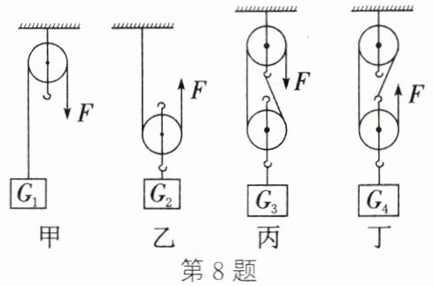 8. 如图所示,人对绳的自由端拉力F都相等,且物体都处于静止状态,不计绳重、滑轮重和摩擦,则四个物体中重力最大的是(
