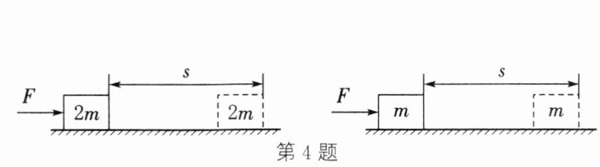 4. 如图所示,用大小相同的力F,作用在质量不同的物体上,使它们分别在同一水平面上沿力的方向移动相同的距离s,F所做的功分别为W₁和W₂,则(