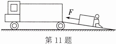 11. (2024·沛县校级段考)如图所示,工人在往车上搬运箱子时,先用3m长的木板搭了一个斜面,再用500N的推力把120kg的箱子沿斜面匀速推到1m高的车厢上,用时10s。g取10N/kg。求:
