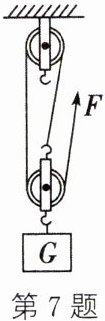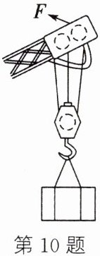 10. (教材P23练习T3变式)(2024·徐州期中)建筑工地上,起重机吊臂上的滑轮组如图所示。在匀速起吊重4.2×10³N的物体时,物体5s内上升了6m,作用在自由端拉力的功率为6.3kW。问:(g取10N/kg)