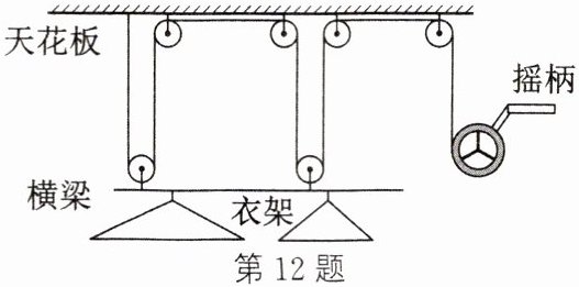 12. 25 80% 解析:由图可知,有4段绳子拉着动滑轮,不计绳重和摩擦,则拉力的大小$F = \frac{1}{n}(G + G_{横梁}) = \frac{1}{4} × (40\ N + 10\ N) = 12.5\ N$;晾衣架上升高度$h = vt = 0.1\ m/s × 5\ s = 0.5\ m$,有4段绳子拉着动滑轮,钢丝绳自由端移动的距离$s = 4h = 4 × 0.5\ m = 2\ m$,拉力做的总功$W_{总} = F_s = 12.5\ N × 2\ m = 25\ J$。有用功$W_{有用} = Gh = 40\ N × 0.5\ m = 20\ J$,则手摇升降晾衣架的机械效率$\eta = \frac{W_{有用}}{W_{总}} × 100\% = \frac{20\ J}{25\ J} × 100\% = 80\%$。