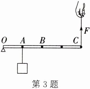 3. 如图所示为一根均匀的细木棒OC,OA=$\frac{1}{4}$OC,B为OC的中点。小明在C点施加始终竖直向上的拉力F将挂在A点的重为180N的物体匀速提升0.2m,细木棒的机械效率为90%,不计摩擦和绳子重。求: