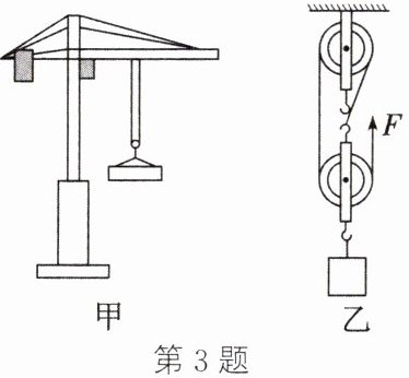 3. (2024·重庆开州期末)中国目前已成为世界基建强国,如图甲所示的塔吊是基建的常用设备,其部分结构可简化为如图乙所示的滑轮组模型。已知物体质量为 120 kg,动滑轮的重量为 300 N,在绳子自由端施加拉力 F 后物体在 10 s 内匀速上升 5 m。不计绳重和一切阻力,g 取 10 N/kg。求: