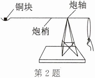 2. (2024·新乡获嘉模拟)如图所示,小强利用一次性筷子、勺子、细线、金属环等制作了古人常用的弹射武器——抛石机模型。用质量为 80 g 的实心正方体铜块作为“炮弹”,手指竖直向下拉动金属环,使“炮梢”水平静止,此时“炮轴”到铜块重心的距离为 30 cm,“炮轴”到细线的距离为 10 cm,金属环与手指的接触面积是 25 mm²。不计模型自重及摩擦,g 取 10 N/kg。