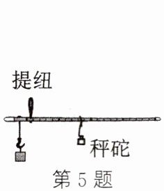 5. 生活中常见的杆秤如图所示。称量时杆秤在水平位置平衡,被测物体和秤砣到提纽的距离分别为$0.05m$、$0.2m$,秤砣的质量为$0.1kg$,秤杆的质量忽略不计,则被测物体的质量为