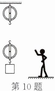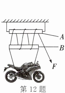 12. 一种利用滚轴和绳子组装的特殊机械如图,借助这种机械可以将较重的物体搬运到高处,某人借助该机械吊起一辆摩托车。不计绳和机械自重,下列说法错误的是(