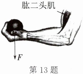 13. (2023·丰县期末)如图所示,手握铅球抬起手臂时,手臂在肱二头肌的拉力作用下绕肘关节转动。下列说法正确的是(