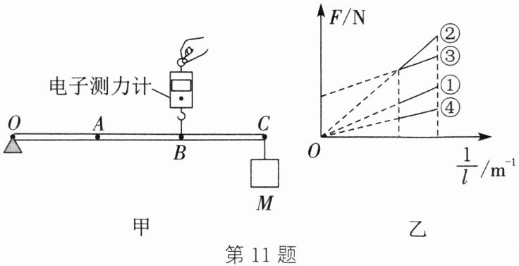 11. 如图甲,轻质杠杆可绕$O$转动,$C$点悬挂一重为$G$的物体$M$,$B$点受到电子测力计竖直向上的拉力$F$,其力臂记为$l$,保持杠杆水平静止,此时$F$与$\frac{1}{l}$的关系图线为图乙中的①,某次操作后,仍保持杠杆水平静止,$F$与$\frac{1}{l}$的关系图线变为图乙中的④,则可能进行的操作是(
