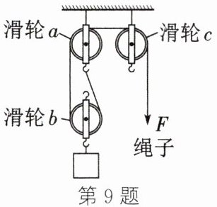 9. 为了赶在雨季之前给住在铜山的奶奶做一次房屋维修,爸爸专门请了一个小型施工队。这个施工队利用$3$个相同的滑轮组成滑轮组将材料运送到高处,滑轮组的结构如图所示。已知每个滑轮重为$50N$,绳子能够承受的最大拉力是$500N$,忽略绳重和摩擦。用此滑轮组提升材料,下列说法与实际不相符的是(