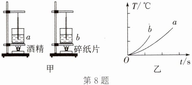8. (2023·大连期末)在“比较酒精和碎纸片的热值”实验中,某小组用如图甲所示的装置进行实验,图中燃烧皿、烧杯 $a$和 $b$、温度计均完全相同,烧杯中盛有水。实验时,点燃放在燃烧皿中的酒精和碎纸片,通过陶土网给烧杯加热,直至酒精和碎纸片完全烧尽。