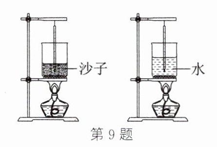 9. (2023·新沂期中)为了比较水和沙子吸热升温的情况,小明做了下列实验:在两个相同的烧杯中分别装有质量、初温都相同的沙子和水,用两个相同的酒精灯对其加热,实验数据记录如表所示,实验装置如图所示。