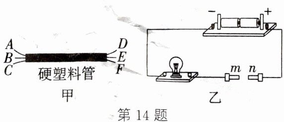 14.(易错题)如图甲所示,在一根横跨河流两岸的硬塑料管内穿有三根完全相同的电线。为了辨别哪两个线头为同一根导线的两端,可用如图乙所示的测通器来测试,其操作过程如下: