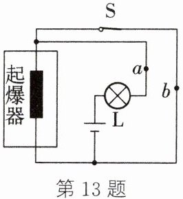13. a 没有 有 解析:由题意和电路图可知,起爆前定时开关S是闭合的,此时起爆器被开关所在导线短路,没有电流通过起爆器,所以起爆器不工作。当设定起爆时间一到,定时开关S会自动断开,此时起爆器中有电流通过,引爆炸弹,因此为了使引爆装置停止工作,应将起爆器、灯泡与电源构成的串联电路断开,即应剪断a处的导线,此时电路处于断路状态,爆炸装置不工作。由电路图可知,起爆时间到达前,起爆器被开关所在导线短路,没有电流通过起爆器,所以起爆器不工作,灯泡L有电流流过。