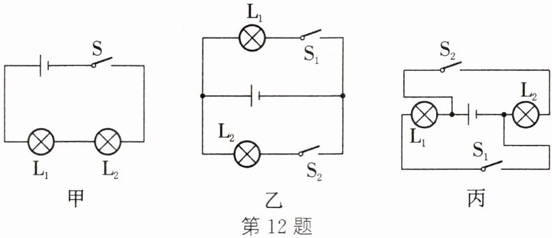 12. 如图所示的电路图中,图甲中L₁、L₂是