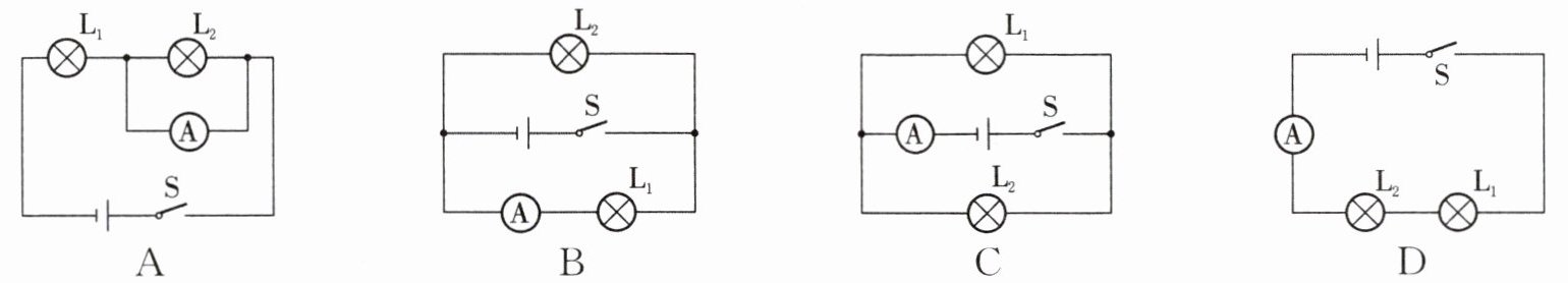6. (2023·睢宁段考)下列电路中,闭合开关后,电流表能正确测量出通过$ L_{2} $的电流的是 (