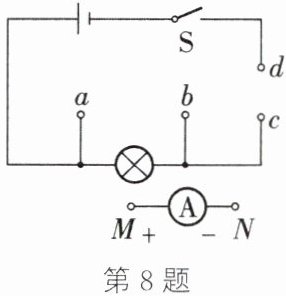 8. 如图所示,$ a、b、c、d $为电路中的四个接线点,若用电流表测量通过小灯泡的电流,则电流表的$ M、N $接线柱与电路中各接线点的连接关系为 (