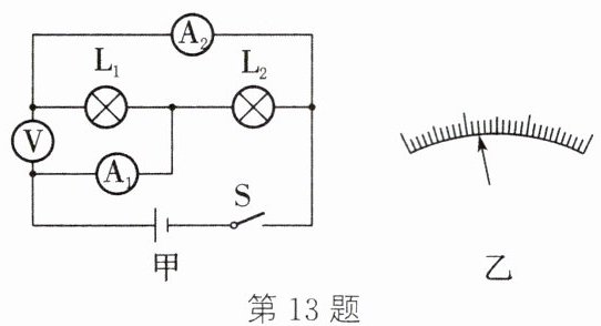 13. 如图甲所示,$S$闭合后,$A_1$、$A_2$、$V$三只电表的指针位置均如图乙所示,已知电压表$V$接入的是“-”和“15”接线柱,则电源电压为