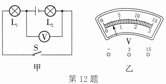 12. 如图甲所示,闭合开关$S$,两小灯泡串联,电压表测的是