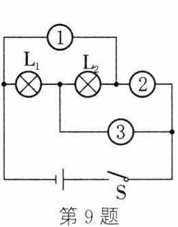 9. (2024·洛阳汝阳一模)在如图所示的电路中,1、2、3处是三个电表(电压表或电流表)。闭合开关$S$,要使灯$L_1$与$L_2$串联,则电路中