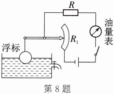 8. 如图是自动测定油箱内油量的装置,闭合开关后,当油位上升时,关于油量表和R₁接入电路中的电阻情况,下列说法正确的是(