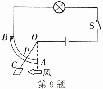 9. 一名同学设计了一个风力测定仪,如图所示,O是转动轴,OC是金属杆,下面连接着一块受风板。无风时OC是竖直的,风越强,OC杆偏转的角度越大。AB是一段圆弧形电阻,P点是金属杆与圆弧形电阻相接触的点,电路中接有一个小灯泡,测风力时,闭合开关S即可。通过分析可知:金属杆OC与圆弧形电阻AB组合在一起相当于一个