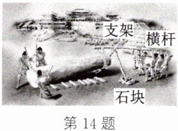 14. (2024·石家庄新华模拟)我国古人运送巨木的劳动情境示意图如图所示。他们通过横杆、支架、石块等,将巨木的一端抬起,垫上圆木,以便将其移到其他地方。如果他们无法将巨木抬起,请你提出两个有可能抬起巨木的方案。