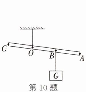 10. 悬挂重物G的轻质杠杆,在力的作用下倾斜静止在如图所示的位置。若力施加在A点,最小的力为$ F_A $;若力施加在B点或C点,最小的力分别为$ F_B $、$ F_C $,且AB=BO=OC。下列判断正确的是(